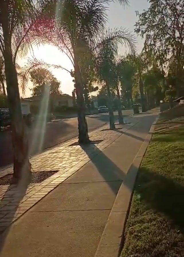sunlit street in what appears to be a suburban neighborhood. The sun is shining brightly, partially obscured by palm trees lining the sidewalk. The sidewalk is concrete and has a strip of brick pavers on one side. The other side is bordered by a strip of grass. The shadows of the palm trees stretch across the sidewalk. Cars are parked along the street in the background, and there are houses visible in the distance.