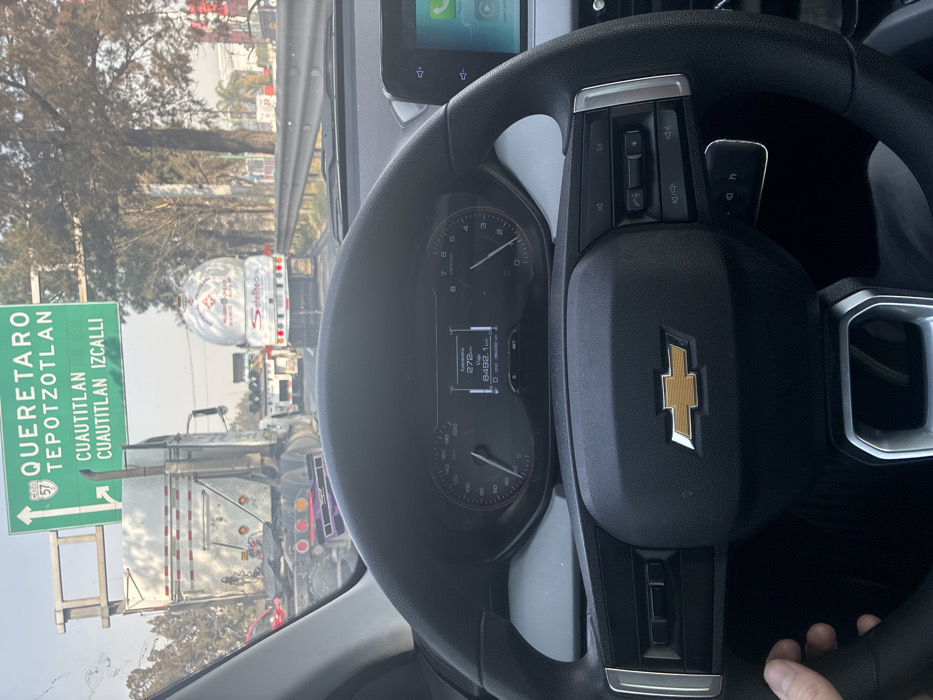 A view from inside a car shows a black Chevrolet steering wheel with a golden bowtie logo