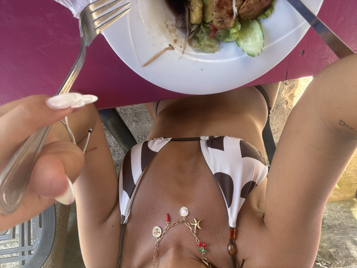 A low-angle shot of a person at a table wearing a white and brown bikini. The person holds a fork and knife over a plate with chicken and salad. A gold body chain with charms adorns the bikini top. The table appears to be purple, and a chair is visible in the lower left corner. Tattoos are seen on both arms.