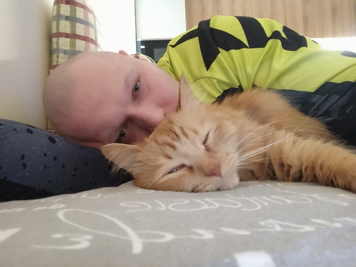 In an indoor setting in Кондратово, Russia, a bald individual with light-colored eyes is depicted lying on their left side, looking directly towards the viewer. They are wearing a bright neon yellow shirt with black geometric patterns. Their head rests on a dark blue pillow featuring a dotted pattern. Adjacent to the person's head, an orange, long-haired cat is observed lying on a light grey surface adorned with faint white script-like patterns. The cat's eyes are partially closed, indicating rest or sleep. A plaid pillow (red, white, brown) is visible behind the person's head against a light-colored wall. In the background, light-brown wood paneling and a dark-fronted appliance or window are partially visible.