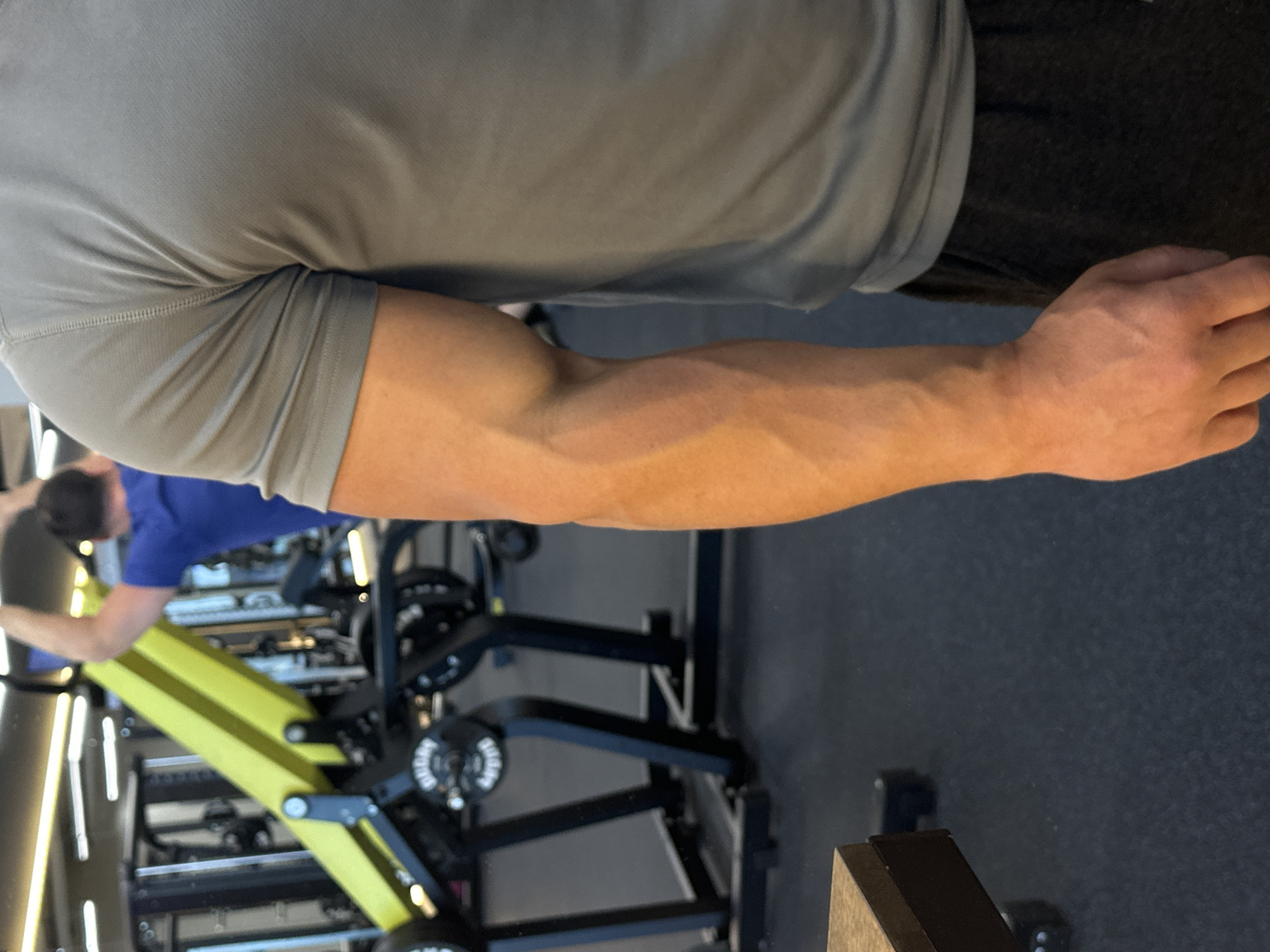 muscular forearm with prominent veins, likely belonging to a person in a gym setting