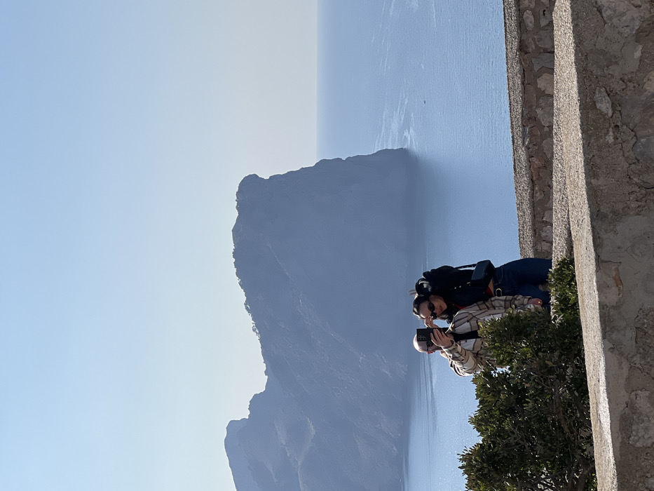 The scene depicts two individuals on a bright, clear day at Cap de Formentor, Pollença, Spain, overlooking the Mediterranean Sea and rugged coastal cliffs