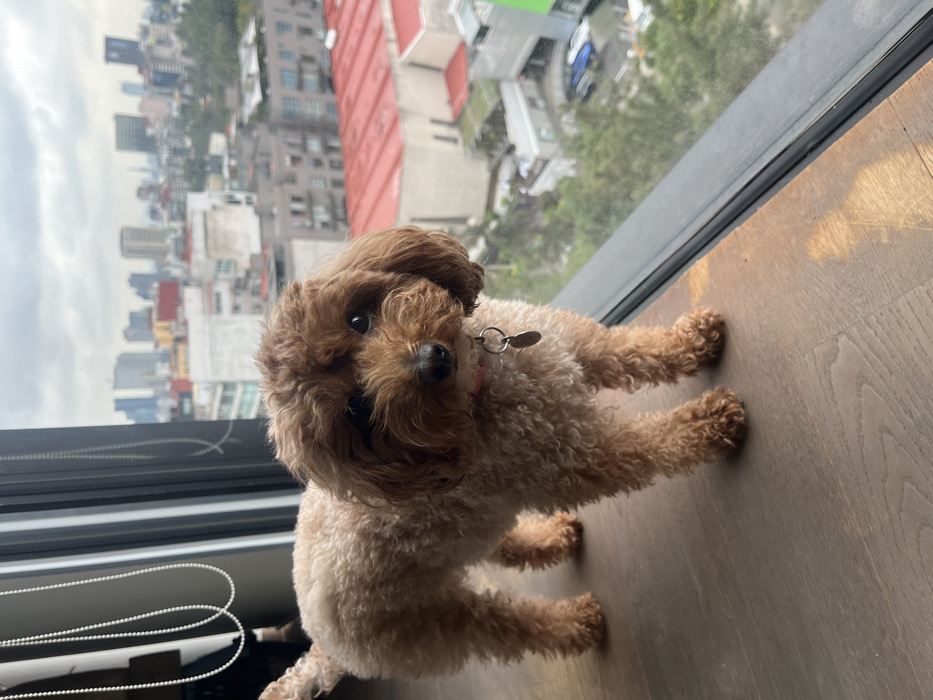 - "A small, light brown, curly-haired dog, resembling a miniature poodle, stands on a light wooden floor" by FM-lAJLT2, licensed under CC BY 4.0