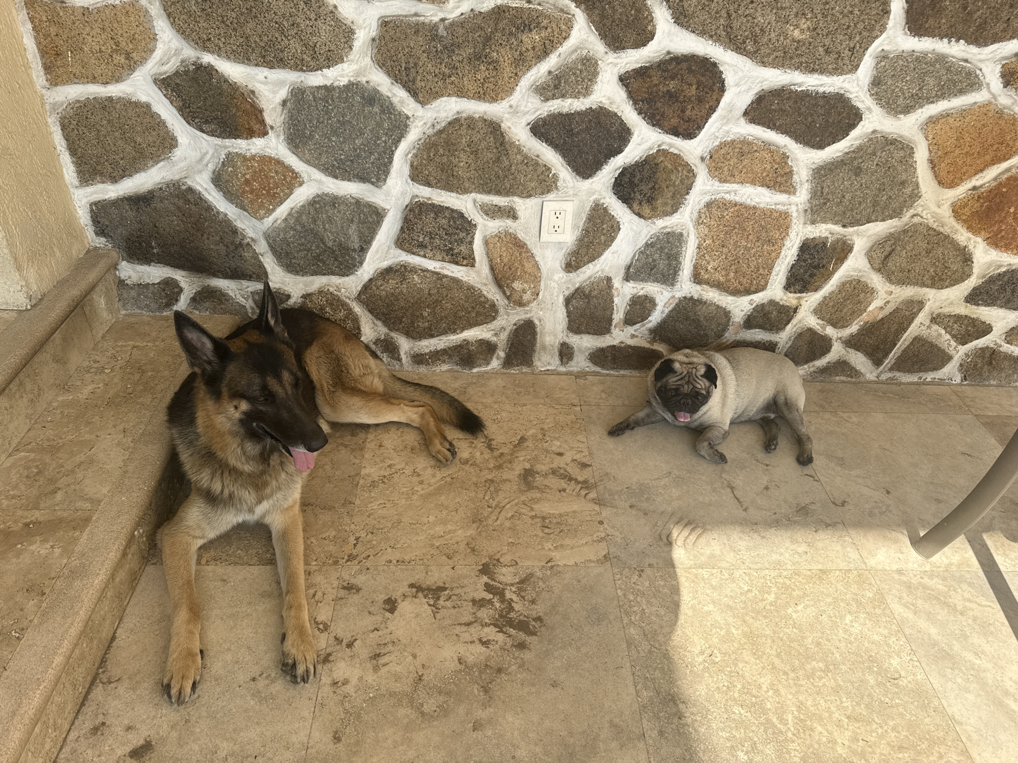 A medium shot features two dogs in what appears to be an outdoor area, likely a patio or terrace, with a stone wall behind them. The larger dog, a German Shepherd, is lying on the left side of the frame. The smaller dog, a pug, is on the right. Both dogs are lying on the floor, which appears to be made of stone tiles. The scene is well-lit, suggesting it is daytime. The stone wall has a rustic look with different sized stones and white grout. The image doesn’t provide sufficient details to confirm the location in Acapulco, Mexico.