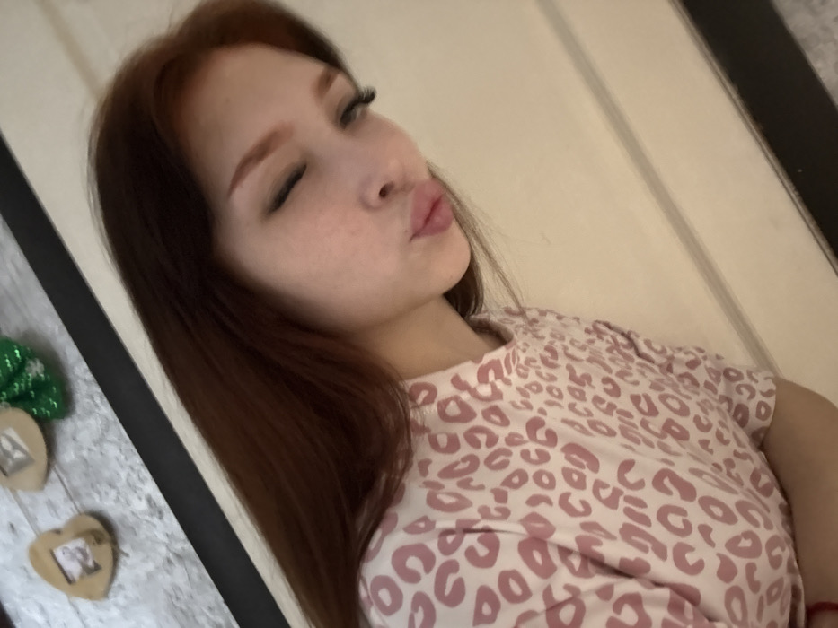 A female individual is depicted in an indoor setting, stated to be in the city of Ольховка, Russia. The subject, appearing as a young adult, has long reddish-brown hair and fair skin with visible freckles on the cheeks. She is observed from the chest up, with her eyes closed and lips pursed in a 'kissing' expression, enhanced by dark eyelashes and shaped eyebrows. She wears a light-colored garment adorned with a light pink leopard print pattern. The background features a light-toned, possibly wooden, surface displaying two heart-shaped wooden ornaments, one of which contains a small framed image, and a partial view of a green textured decorative item. A black horizontal molding separates this area from a plain, light-colored wall or door that fills the right side and lower portion of the background. The image is captured with a discernible upward tilt from the viewer's perspective.