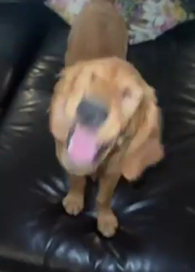 A person pets a golden retriever puppy on a black leather couch. The puppy stands and looks at the camera with its tongue out, then jumps off the couch. The couch has a floral-patterned pillow on it.