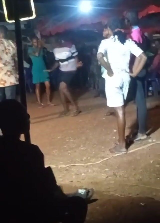 A low-quality video shows a group of people dancing outdoors at night under artificial lights. The ground appears to be dirt. Several people can be seen dancing and socializing. One person is sitting in the foreground, facing the crowd. Other details are hard to make out due to the poor resolution and lighting.