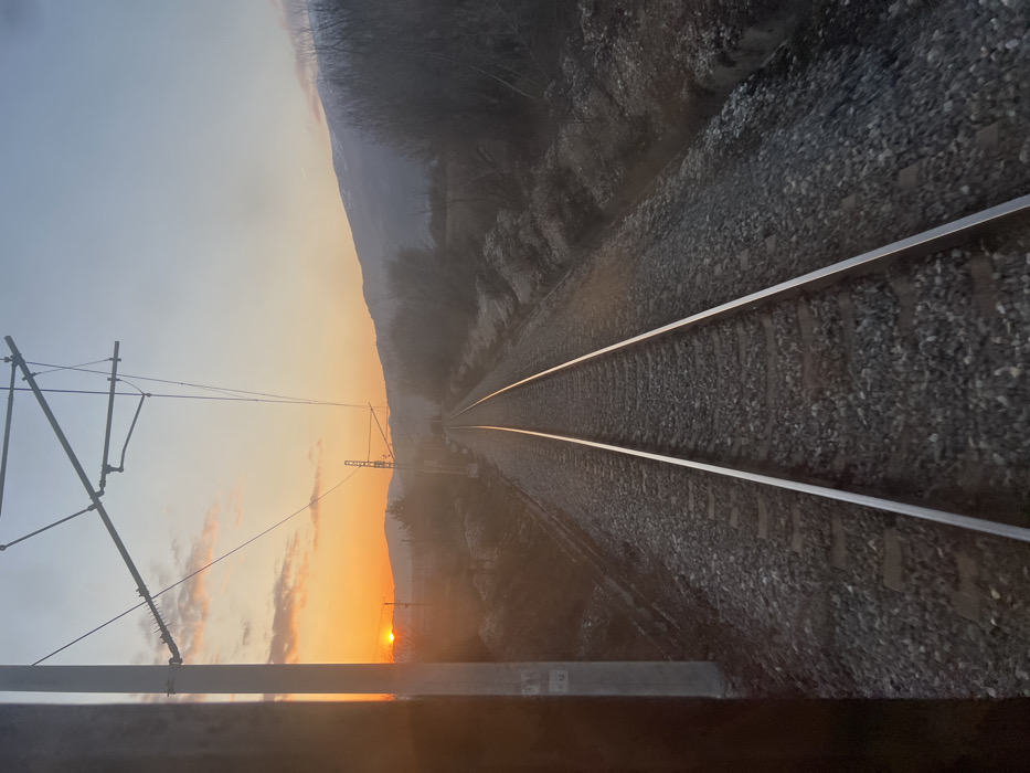 The image depicts an expansive view of a single-track railway line near Dushantsi, Bulgaria, at either sunrise or sunset. The sun, a bright orange disk, is partially visible on the left horizon, casting a warm orange glow across the lower sky which transitions to a light blue in the upper portion. The railway tracks, comprised of two parallel steel rails, recede into the distance, resting on a bed of dark grey gravel ballast and sleepers. The rails brightly reflect the warm light from the low sun. To the immediate left, a dark vertical structural element, possibly part of a train's interior or window frame, partially obscures the view. Above the tracks, an overhead catenary system with support wires and a concrete pole is visible. Along both sides of the railway, the ground consists of dirt and scattered rocks, bordered by sparse, bare trees and bushes, suggesting a colder season or an arid environment. In the background, a range of mountains or hills extends across the horizon, with the peaks on the right appearing hazy and tinged with blue. No people, specific actions, or interactions are visible within the scene.