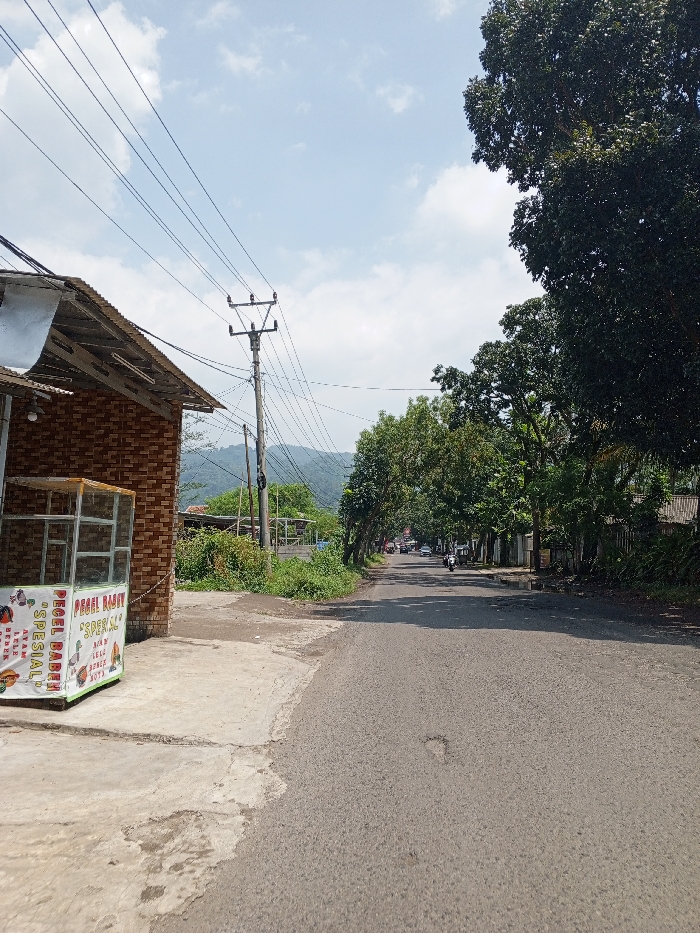 The image depicts a street view in the city of Multhan, India, under a partly cloudy sky. In the foreground on the left, a single-story structure with red-brown brick walls and a corrugated metal roof stands adjacent to a concrete sidewalk. A glass-enclosed food display cart, featuring a white banner with red lettering including "PEGEL RABBY" and "SPESIAL," is positioned on the sidewalk next to the building. An asphalt road occupies the central and right portions of the frame, extending into the distance. The road surface exhibits minor depressions. To the left of the road, a wooden utility pole with multiple electrical wires is visible, with wires traversing the upper left quadrant of the image. Adjacent to the utility pole and extending towards the background are patches of unkempt ground and dense green vegetation. The road is lined with numerous mature green trees on both sides, forming a partial canopy further down the thoroughfare. In the mid-distance along the road, several vehicles are present, including at least one motorcycle and multiple cars. The background features a range of green, undulating hills or mountains. No individuals are clearly discernible in the immediate foreground.