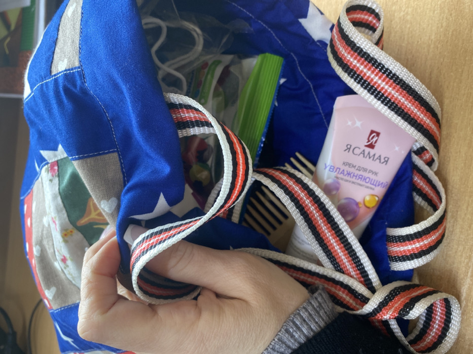The image displays an indoor scene, presumed to be in Ol'khovskoye, Russia, showing a close-up view into an open fabric bag
