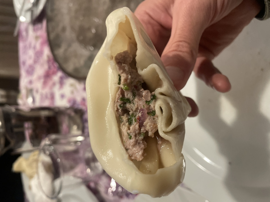 The image depicts an indoor dining scene in the city of Podostrog, Montenegro. A human hand, with light skin tone, is shown on the right side of the frame, holding a large, partially opened dumpling. The dumpling has a thick, smooth, off-white dough wrapper, revealing an exposed filling of light pink ground meat mixed with green herbs and small red fragments. Liquid or broth is visible within the dumpling, and the lower part of the wrapper features distinct pleats. In the blurred background, a table is covered with a purple and white patterned tablecloth. Visible items on the table include a white ceramic plate directly beneath the dumpling, several clear glass drinking vessels (one with a handle, another a taller glass), and portions of darker plates or serving dishes. A blurry light-colored object, likely bread, is also discernible in the upper left background.