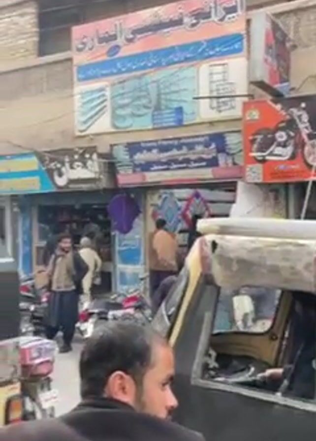 crowded street in what appears to be a South Asian urban area. The street is packed with pedestrians, auto-rickshaws, and motorcycles. Many people are wearing casual clothing, including jackets, sweaters, and hats. Some are wearing traditional garb. There are numerous storefronts lining the street, with signs in a local language (possibly Urdu or Persian) and some in English. The signs advertise various businesses. The lighting is somewhat overcast, and the overall atmosphere is busy and bustling.