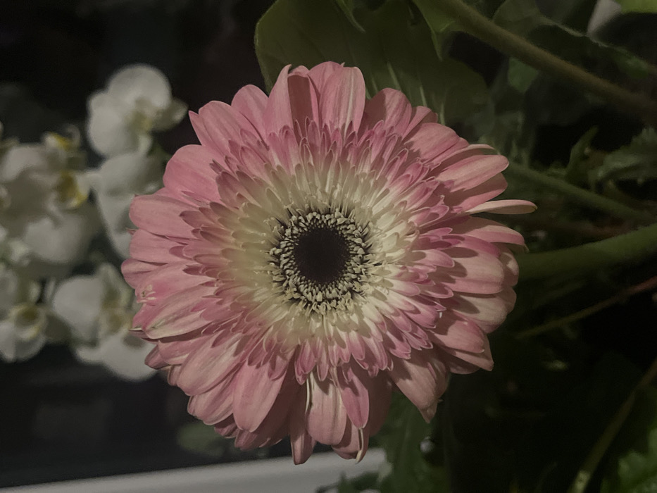 A pink gerbera daisy dominates the frame, its petals transitioning from light pink to a cream center before reaching a dark, textured core. Soft white flowers are blurred in the background to the left, providing contrast. To the right, green leaves and stems are present, though shadowed. The image is softly lit, emphasizing the flower's intricate details.