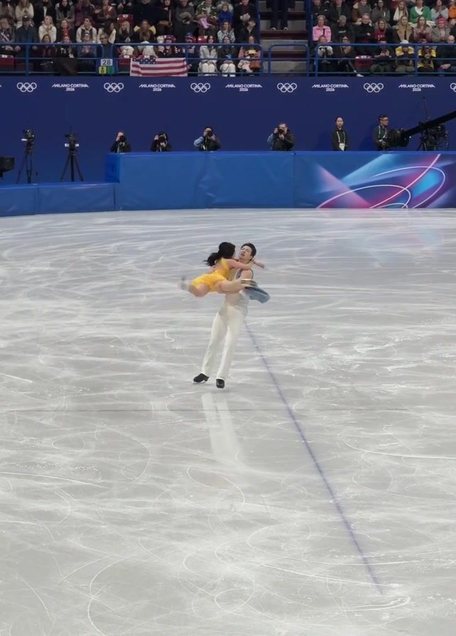 two ice skaters, a man and a woman, performing a figure skating routine. The man is dressed in white pants and a light blue top. The woman is wearing a yellow dress. They are in the middle of an ice rink with a large crowd watching in the background. There is a blue barrier behind the crowd with the Olympic rings on it. The skaters perform a lift, with the man briefly holding the woman in the air, before she slides down to the ice. They then both strike a pose before continuing to skate independently.