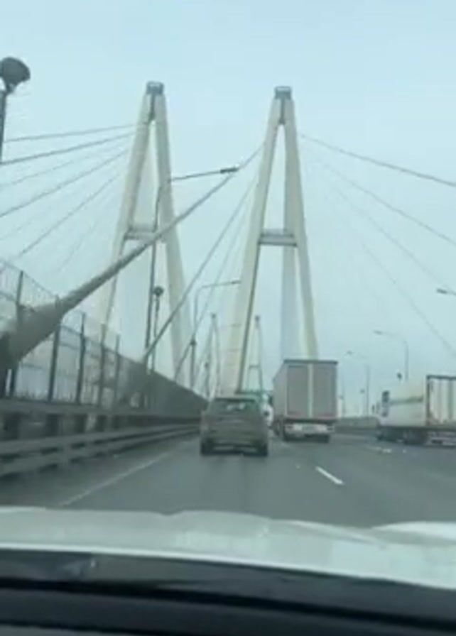 driver's perspective of driving on a bridge with two large, white, cable-stayed towers. It is daytime and the sky is overcast. The road has multiple lanes of traffic, including cars and large semi-trucks. The towers of the bridge are visible in the distance, connected to the roadway by numerous cables. The view is shot from inside the vehicle, focusing primarily on the road ahead and the architectural structures of the bridge.