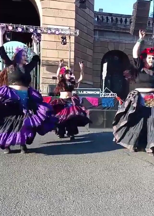 - "Three women in dark-colored belly dancing costumes with skull face paint and flower crowns are performing a choreographed dance routine on an asphalt surface" by FM-Luk4a2, licensed under CC BY 4.0