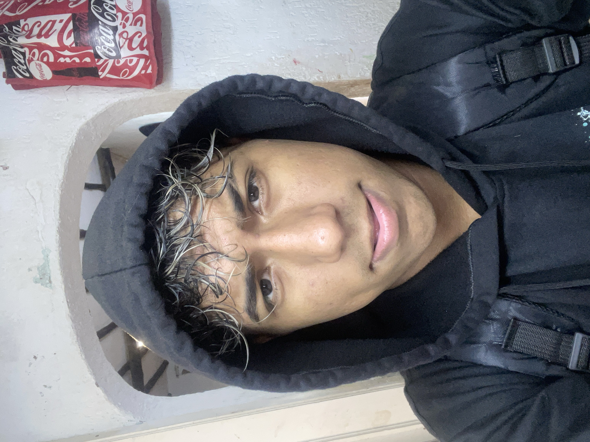 A person is wearing a black hooded sweatshirt, facing the camera at an angle. Their hair is dark with light highlights. A Coca-Cola patterned object is located in the upper left of the image. The background shows a curved, white architectural element, possibly a window or archway, suggesting an indoor setting. Due to the lack of distinct geographical details in the image, providing an exact location in Porlamar, Venezuela, is impossible.