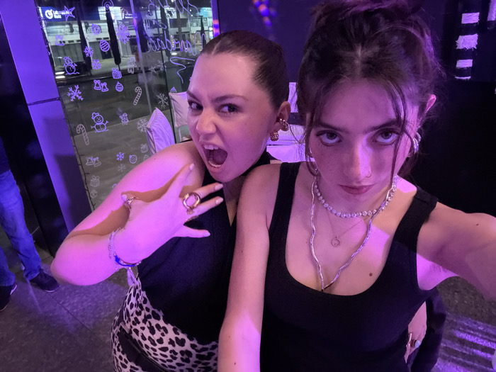Two young women pose indoors under purple-toned lighting. The woman on the left has her hair pulled back, wears statement rings and earrings, and is making a playful, open-mouthed expression while wearing a black top and leopard print skirt. The woman on the right has her dark hair in a messy bun, wears multiple necklaces and earrings, and has a serious expression. A partial view of a person in jeans can be seen on the left edge. The background includes a glass wall decorated with winter-themed images.