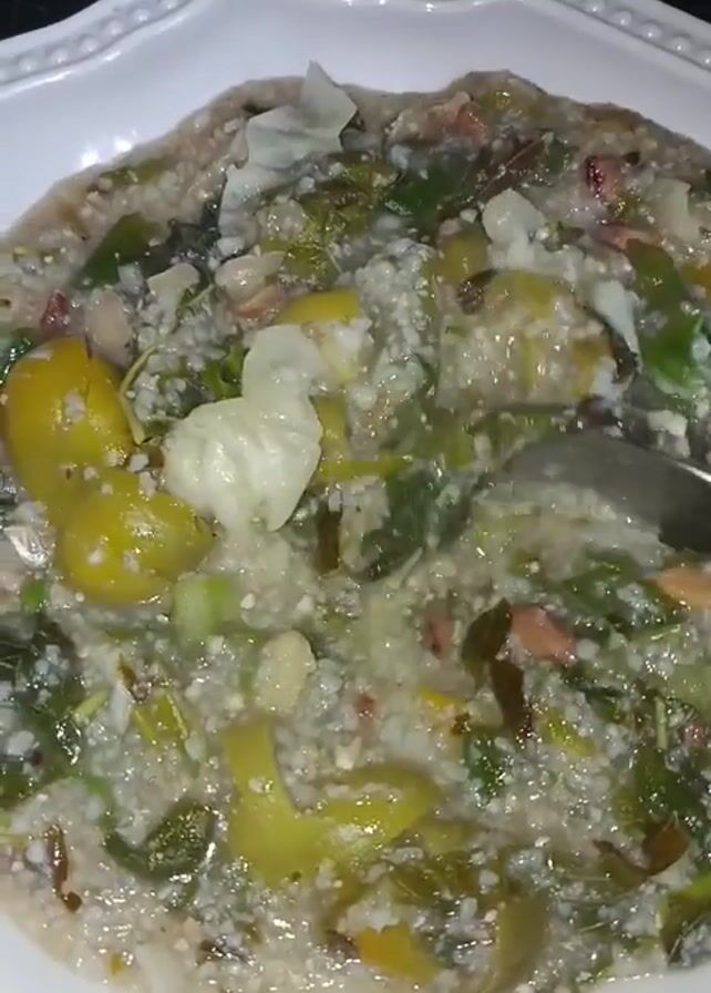 white square plate with a scalloped edge containing a greenish-gray stew-like dish. The dish contains green leaves, yellow and white vegetable pieces, and small grain-like particles. A silver spoon or fork is being used to stir the dish. The plate is sitting on a black and white marble or granite countertop.
