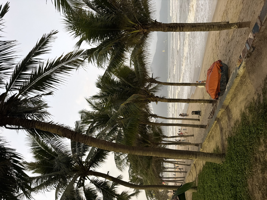 The image presents a panoramic view of a sandy beach in An Hải Ward, Vietnam. A line of numerous tall palm trees with green fronds runs parallel to the coastline, dominating the foreground and midground. To the left, a strip of green ground cover or low vegetation separates a sandy path from the main beach area. A low concrete or stone barrier is visible between the green area and the sand. On the sandy beach, numerous individuals, estimated between 20 to 30 people, are dispersed, appearing to walk or stand in small groups. Their features are not distinctly visible due to distance. In the midground, towards the right, a dark, circular basket boat (thúng chai) is resting on the sand, partially covered by a bright orange tarpaulin. Further along the beach, a dark-colored, two-wheeled cart-like object is visible near a group of people. The ocean, characterized by white-capped waves breaking on the shore, occupies the right side of the image. In the distant background, a mountainous coastline is visible across the water, with a prominent light-colored structure, possibly a monument or large building, situated on a distant hill. The sky appears overcast or hazy, casting soft, diffused light across the scene.