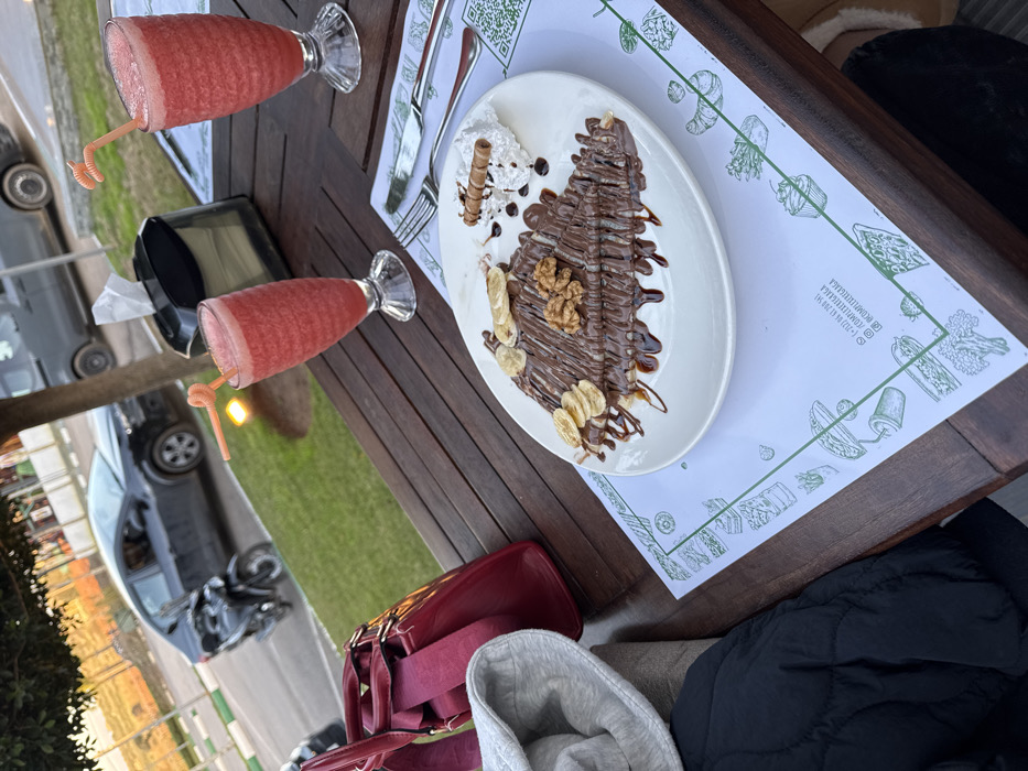 A tabletop scene features two pink drinks with straws in stemmed glasses. Adjacent is a white plate holding a chocolate-covered crepe adorned with banana slices and walnuts, accompanied by whipped cream and a wafer roll. Cutlery rests next to the plate on a placemat printed with food illustrations and text. A dark wooden table surface is visible, with elements of a gray hooded sweatshirt, burgundy purse, and black jacket suggesting a personal dining setting. A blurred outdoor view with a car and greenery is partially visible in the background.