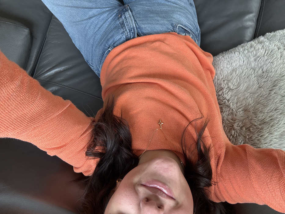 A single individual is depicted in an indoor, domestic setting within Baden, Austria. The person, identifiable as female with dark brown hair, is lying supine on a dark-colored, likely leather or faux leather, sofa. A light-colored, textured faux fur throw or cushion is partially visible beneath the individual's right side. The individual is wearing an orange, long-sleeved, textured top and light blue denim jeans. A thin gold chain necklace with a small, four-pointed star pendant is visible on the chest. A small gold hoop earring is present in the left earlobe. The lower-left portion of the individual's face is visible, including the left cheek, chin, and lips, which exhibit a glossy appearance. A faint smile is discernible. The image is captured from an overhead, self-portrait perspective.