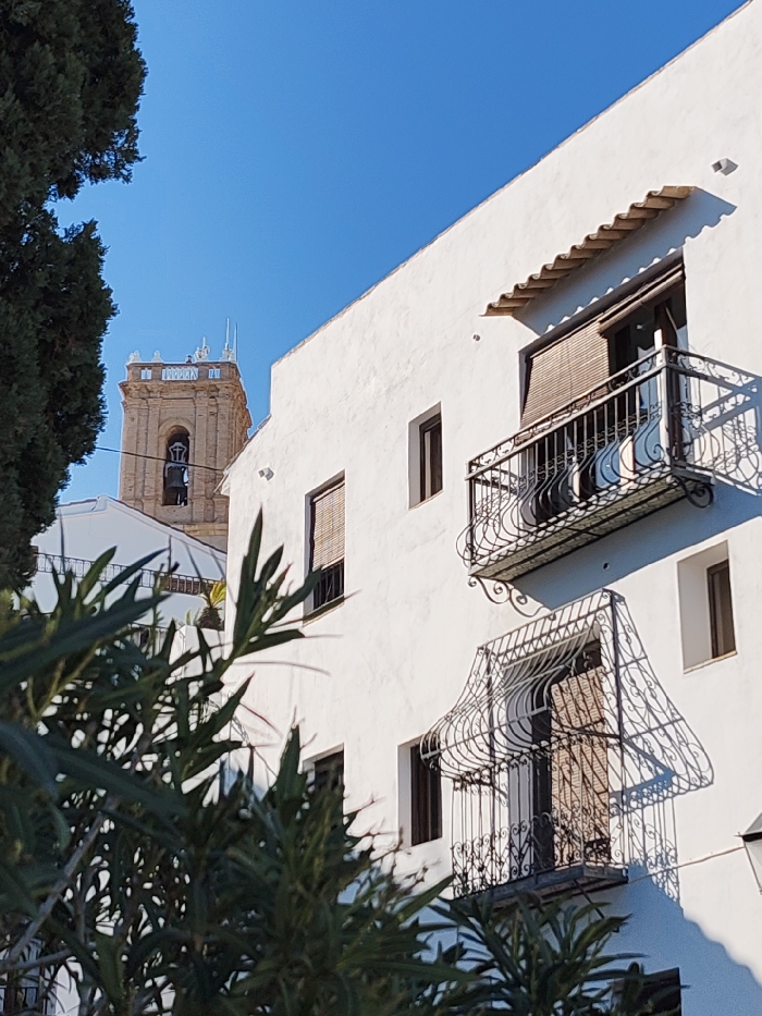 A white, multi-story building with wrought-iron balconies and partially drawn blinds is bathed in sunlight. The architectural style is Mediterranean. A church tower with a bell is visible behind the building, framed by a tree on the left. Another tree, with dense green foliage, partially obscures the view in the foreground. The sky is clear and blue.