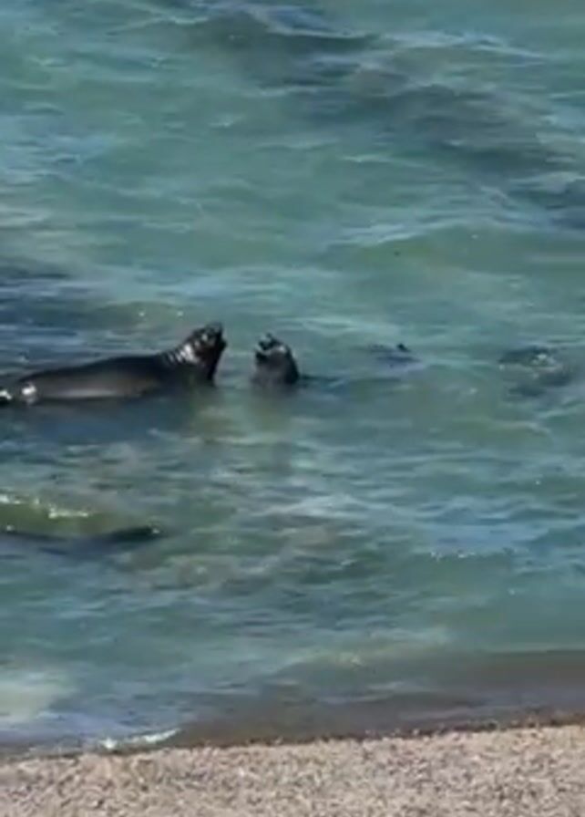 group of seals in the ocean near a shore. Two seals are close to each other, with their heads above the water, appearing to interact. Other seals are visible further out in the water, with their heads or fins occasionally surfacing. The water is light blue with some wave action, and a sandy shore is visible in the foreground.