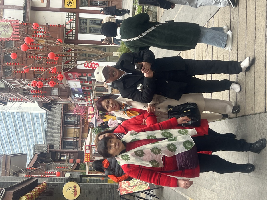 This image depicts an outdoor pedestrian street in Banan, China, under overcast lighting conditions. Five Asian adults are walking towards the viewer on a paved walkway composed of light-colored stones and wooden plank-like sections. From left to right in the foreground: 1. An older woman with dark, short hair wears a red long-sleeved top, a white scarf with green floral patterns, black pants, and black shoes. She carries a dark purple quilted cross-body bag and looks directly at the camera. 2. Partially obscured behind the first woman, another woman in a red jacket is visible, with her arm linked with the next woman. 3. An older woman wears a light beige long coat, an orange, yellow, and blue patterned scarf, light-colored pants, and dark shoes. She carries a black shoulder bag with a gold-colored chain strap. 4. An older man wears a black overcoat, black pants, white shoes, and a white baseball cap featuring a dark 'B' logo. He is smiling broadly and holding a silver smartphone with both hands, looking towards the camera. A silver thermos or bottle is clipped to his left side. 5. Partially visible on the far right, another individual is seen from behind, wearing a dark green long cardigan or coat, light blue loose-fitting jeans, and white shoes. A white strap is visible over their right shoulder. The street is lined with traditional Chinese-style buildings featuring dark tiled roofs and wooden facades. Numerous red spherical lanterns and strings of smaller red decorations hang from tree branches and building eaves throughout the scene. A tree with pink blossoms is visible in the mid-ground. Vendor stalls with white awnings are present further down the street. In the background, a tall, modern high-rise building with a grid of windows contrasts with the traditional architecture. Signs with Chinese characters are visible on storefronts, including a circular yellow sign on a building to the left.