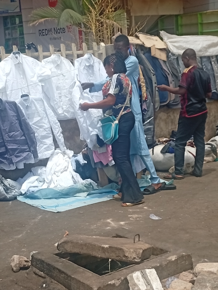 The scene depicts an outdoor clothing market in Maiburiji, Nigeria, under daylight conditions