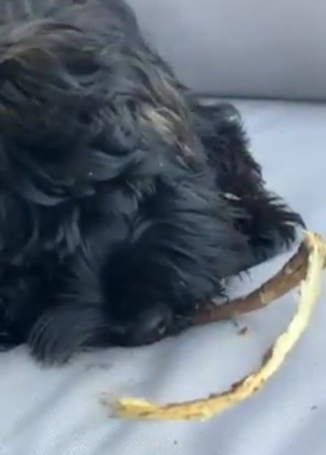A black, fluffy dog is chewing on a light brown stick with a peeled layer
