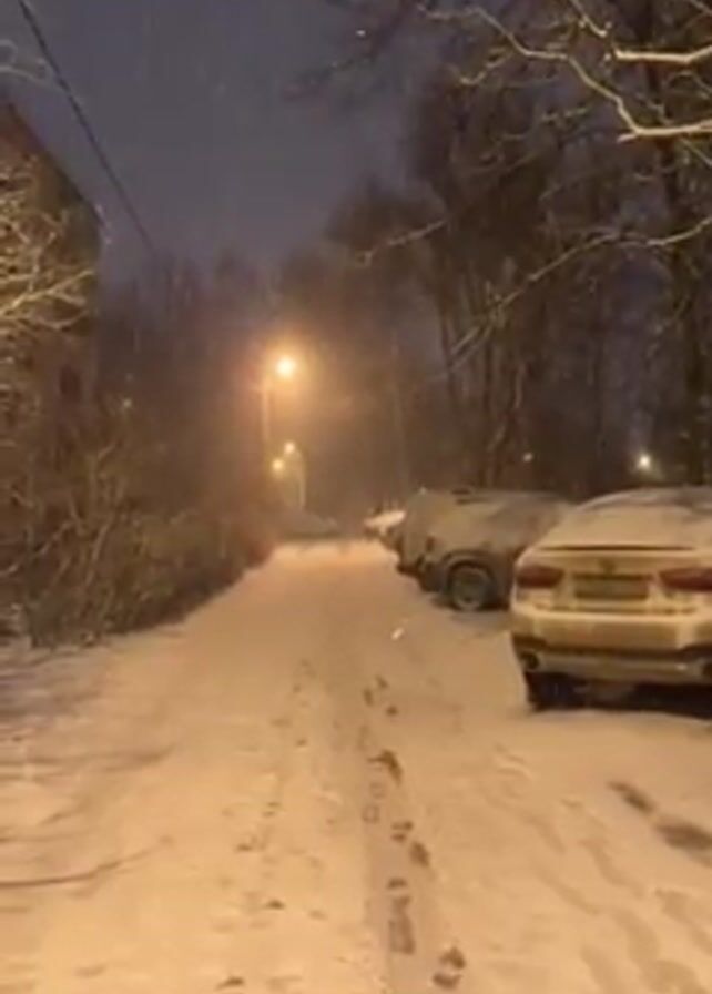 snowy street at night. There are several parked cars covered in snow on the right side of the street. Bare trees line the street, and snow is falling heavily. Streetlights illuminate the scene with a warm glow. Footprints are visible in the snow on the street. A building is visible on the left side of the street. The overall impression is a quiet, snowy night.