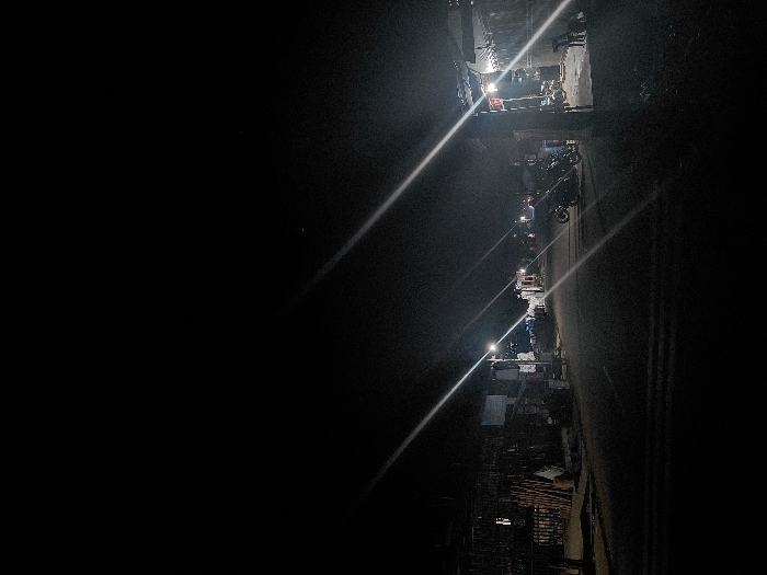 A dark, nighttime scene captures a road illuminated by streetlights. Motorcycles and vehicles are parked along the roadside. Buildings line the edge of the road, partially visible in the dimly lit setting. The heavy contrast between light and shadow creates a stark urban landscape.