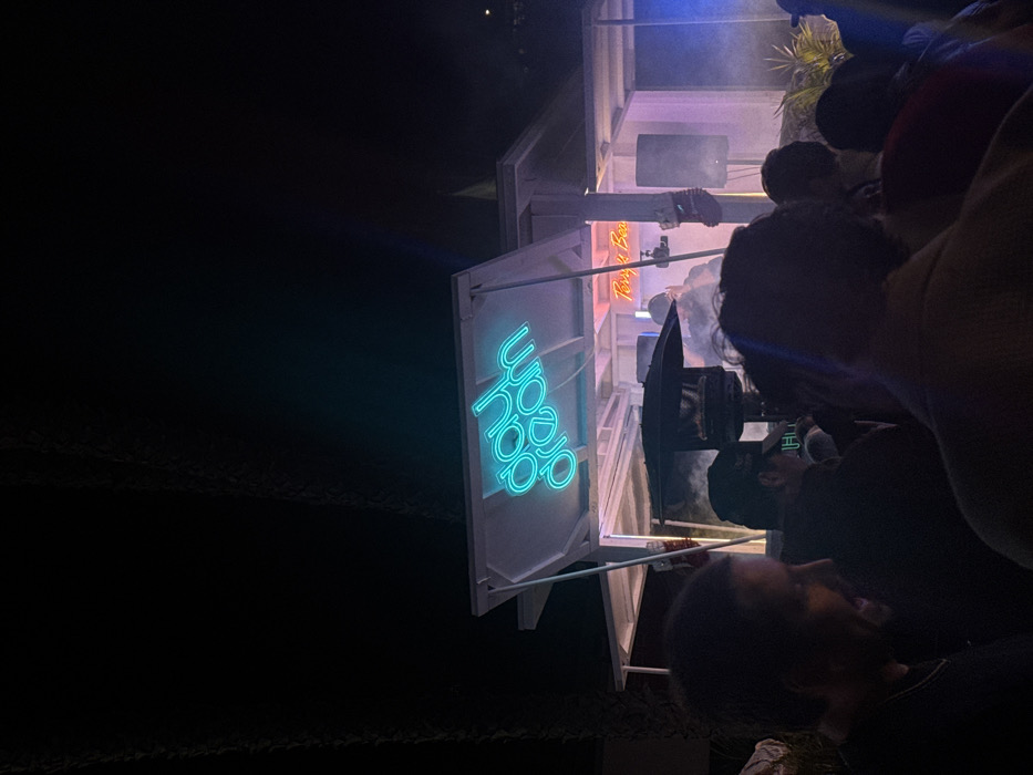A nighttime scene focuses on a bright turquoise neon sign that reads "Dream Beach," vertically stacked. The sign is attached to a white structure, which appears to be a beach bar or small venue. People are gathered, some partially visible in the foreground. Interior lighting suggests a lively atmosphere with music or entertainment. The left side of the image is dominated by darkness, contrasting with the illuminated area. The image is slightly angled, offering a candid, dynamic perspective.