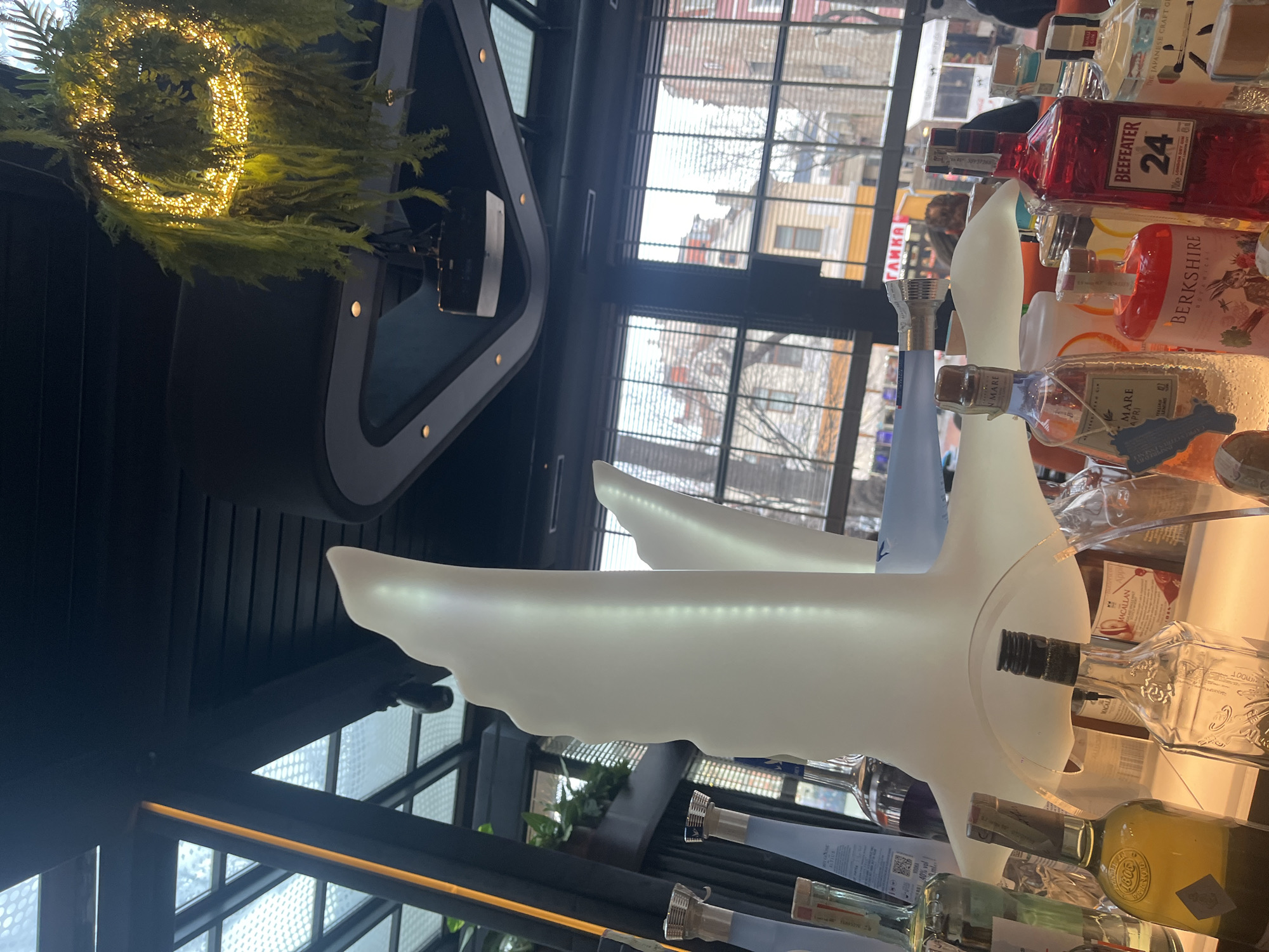 The image captures the interior of a bar or restaurant, looking out through a window onto an urban street scene in Varna, Bulgaria. In the foreground, a prominent, illuminated, translucent white sculpture shaped like a large stylized bird (possibly a swan or goose) stands on a light-colored bar counter. Numerous liquor bottles are arranged on the counter around the sculpture, including recognizable brands such as Beefeater 24 (red bottle), Berkshire Botanical (pink bottle), Mare Capri, and a Japanese craft gin. The interior features a dark ceiling with integrated lighting, a suspended projector, and a decorative hanging plant with embedded warm-toned lights. Large, dark-framed windows with horizontal blinds offer a view of the exterior. Through these windows, multi-story buildings with pitched roofs and varying architectural styles are visible, exhibiting facades in shades of white, cream, yellow, and red. Bare trees suggest a cooler season. The street below shows indistinct pedestrian activity and a white mobile vendor or kiosk. A sign with partially visible Cyrillic text, appearing as "ТАМКА" (TAMKA), is discernible on a building across the street, confirming the urban Varna setting. A blurry individual's head is visible behind the bottles inside the establishment, towards the right.