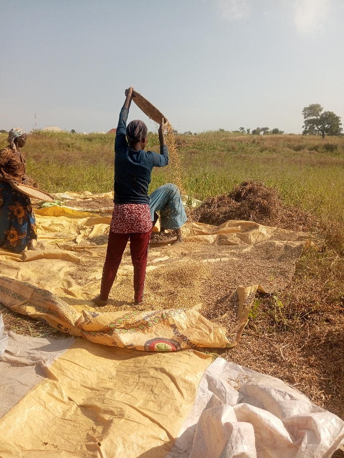 This image depicts an agricultural scene within an open field in the city of Kakau, Nigeria, under a bright, clear sky