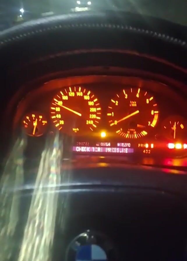 The camera records from the driver's seat of a BMW car, focusing on the dashboard at night