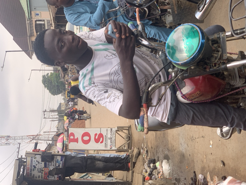 The image depicts a daytime street scene in Egan, Nigeria, under an overcast sky. The foreground is dominated by a dark-skinned male, estimated to be a young adult, wearing a white t-shirt with light patterns and dark pants, seated on a red "BOXER" brand motorcycle with a green-tinted headlight. He holds a light blue smartphone with both hands, looking slightly right of the camera with a neutral expression. To his immediate right, partially visible, another dark-skinned male in a light blue garment is seated on a separate motorcycle. The unpaved dirt road surface is visible, with a puddle and scattered refuse including plastic and paper on the left. To the left of the central figure, a prominent white sign with large red letters "POS" (Point of Sale) advertises phone charging, accessories, repairs, network VTU, bill payment, and TV subscriptions from "XPERT PHONE ACCESSORIES STUDIO". This sign is propped on a wooden stand. Behind it, a commercial building with another sign indicating "CHARGE YOUR PHONE" and "PHONE ACCESSORIES & REPAIRS" is partially visible. In the midground, the street extends into the distance, populated by additional individuals walking and riding motorcycles. A vendor's umbrella and a yellow vehicle are visible further down the road. Overhead, a dense network of electrical wires crisscrosses between utility poles. A tall communication tower is visible on the left side of the frame in the background. Buildings, some appearing multi-story, line both sides of the street under the hazy sky.