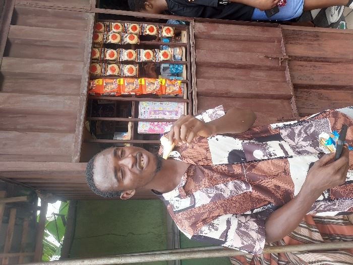 The scene captures a male subject standing in front of a vendor stall in Obosi, Nigeria