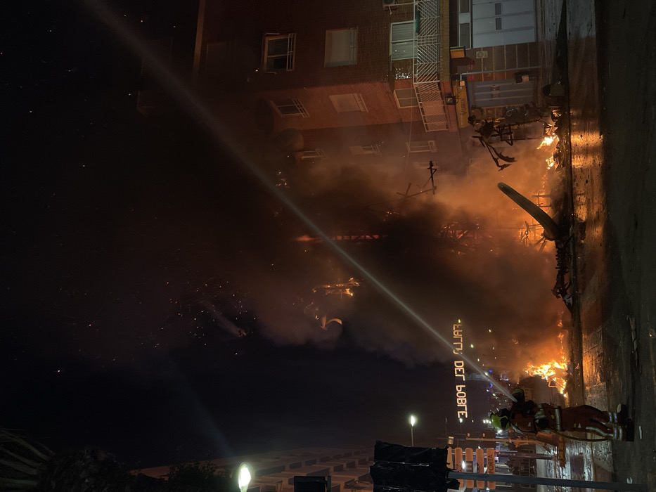 The image captures a nighttime scene in Paiporta, Spain, dominated by a large fire on an urban street