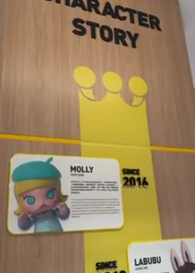 The video displays a wall with a wooden texture, featuring a section labeled "CHARACTER STORY" in large, bold, black letters. Below this, there is a yellow design resembling a crown. Further down the wall, there are informational cards showcasing various character figures. The first card highlights "MOLLY" and indicates that she was introduced "SINCE 2016." The second card features "LABUBU" and indicates that it was introduced "SINCE 2019." The third card introduces "DIMOO," "SINCE 2019" as well. The fourth card presents "SKULLPANDA" introduced "SINCE 2020." The fifth card displays "HIRONO" introduced "SINCE 2021." Each card includes an image of the respective character and a description. The video seems to be taken inside an exhibition or display showcasing character design. The camera slowly pans down, revealing each character story.
