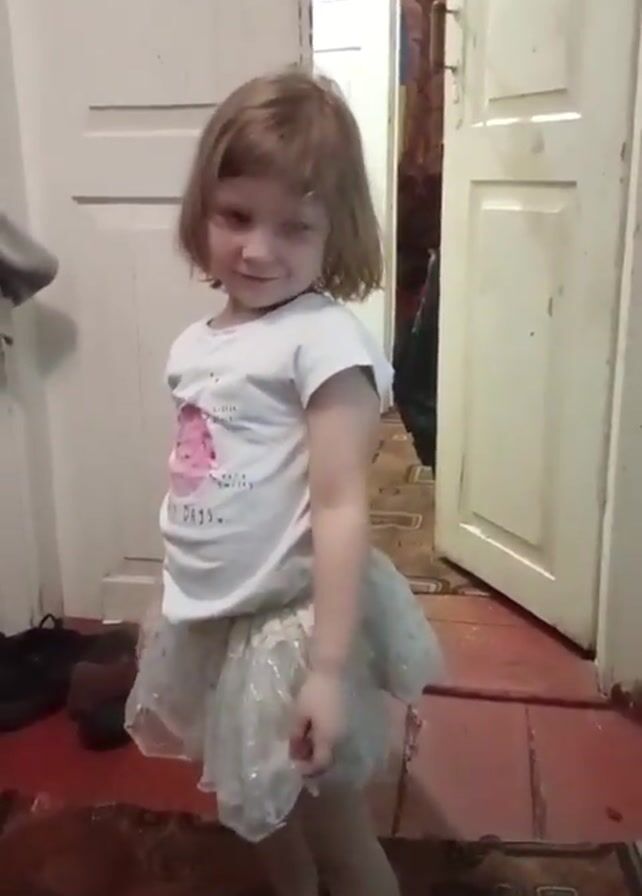 A young girl stands in a doorway, looking at the camera. She has short brown hair, a white t-shirt with a pink design, and a layered white tulle skirt. She is barefoot, standing on a patterned rug in a hallway with white doors. The door behind her is slightly open, revealing items in the room beyond. She smiles, touches her hair, and then resumes a neutral expression.