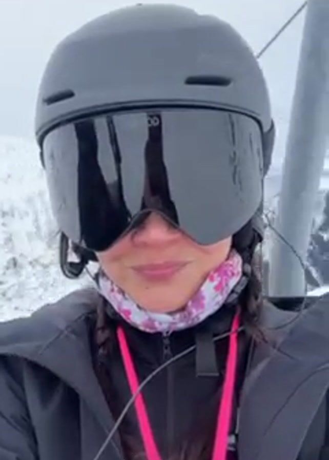 A woman wearing a dark ski helmet and goggles rides a ski lift on a snowy mountain. She is also wearing a black jacket and a pink floral neck covering. The camera is close to her face, and behind her, snow-covered mountains can be seen. The ski lift pole is visible on the left side of the frame. It appears to be a cloudy day.