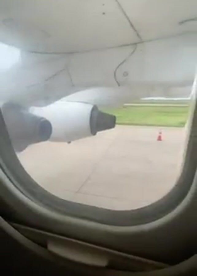 view from an airplane window, looking out at the aircraft wing and engines. The plane is on the ground, with concrete visible below and grass in the distance. A red traffic cone stands on the grass near the runway. The camera is positioned inside the aircraft, framing the view through the circular window.