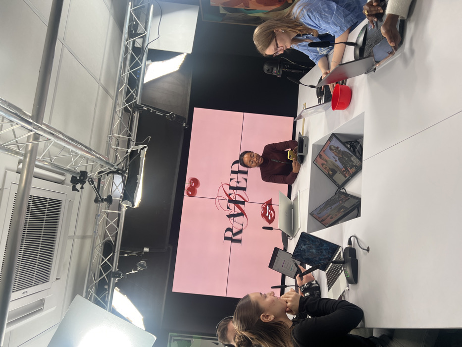 The image captures an indoor media production studio located within the city of Paris, France. Four individuals are seated around a large, white, multi-level table featuring a central recessed section containing two angled monitors displaying visual content. Above, a metal trussing system supports various studio lights and equipment, with a white ceiling and an air conditioning vent visible. A prominent multi-panel video wall dominates the background, displaying a pink graphic with the word "RATED," accompanied by two red cherries, a pair of red lips, and a decorative red line. A dark-skinned woman, wearing glasses and a maroon turtleneck top, is seated centrally at the table, looking down at a yellow smartphone held in both hands. A black flexible microphone is positioned in front of her. To her left, a light-skinned woman with brown hair, wearing a dark long-sleeved top, observes the scene while her hands rest on a silver laptop. Another black flexible microphone is in front of her. To the central woman's right, a light-skinned woman with glasses and a blue checkered shirt is focused on her silver laptop. A red plastic bowl is on the table near her laptop, and a black flexible microphone is also present. The hands and forearms of a fourth individual are visible in the lower right foreground, operating a silver laptop. A professional video camera on a tripod stands behind the rightmost seated woman. The studio setup indicates an active broadcast, recording, or media production session.