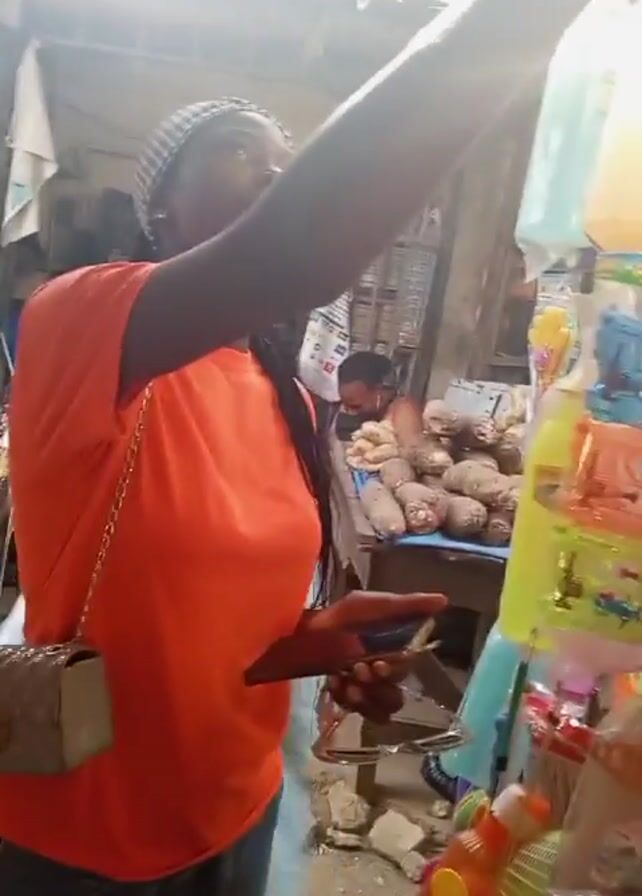A woman in an orange shirt is shopping at an outdoor market