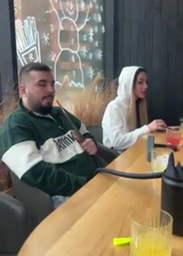 A man and woman are sitting at a wooden table in a restaurant or lounge. The man is on the left, wearing a green and white sweater. He is holding a hookah pipe. The woman is on the right, wearing a white hooded sweatshirt. There are drinks in glasses on the table, and a hookah hose running along the surface. A large window shows a decorated snowman. The man looks at the camera and raises his thumb.