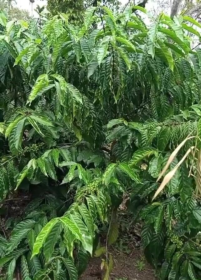 lush coffee plant with green leaves and unripe berries. The plant is dense and healthy, with leaves that have a slightly wavy texture. The coffee berries are small and green, indicating they are still developing. In the background, there are other trees and foliage. The setting appears to be an outdoor coffee plantation.