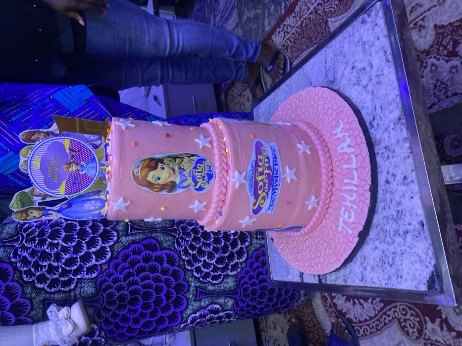 This image depicts a two-tiered, light pink birthday cake situated on a rectangular table with a white granite-patterned surface and a reflective metal frame, indoors in Kwang, Nigeria. The cake is decorated with white fondant stars and colorful sprinkles. The top tier features an edible image of "Sofia the First" holding a small animal, accompanied by the "Sofia the First" logo. The bottom tier displays a larger edible image of the "Sofia the First: The Mystic Isles" logo, also surrounded by white stars. A cake topper includes a circular "Happy Birthday" sign featuring Sofia the First, flanked by various character cutouts of Sofia the First. The pink cake board beneath the cake is textured and has the name "TEHILLAH" written in white raised letters. To the left of the cake, the lower portion of an individual is visible, wearing a dark blue garment with an intricate purple and black paisley or floral pattern. A small white baby shoe with a bow is partially visible near the garment. To the right, another individual's lower torso and legs are present, dressed in blue jeans and black flip-flops. The floor beneath the table is covered by a patterned rug or carpet, featuring dark and lighter intricate motifs. The immediate background includes a faint white furniture piece and darker wall sections. The scene is illuminated by artificial lighting, casting a slight bluish tint.
