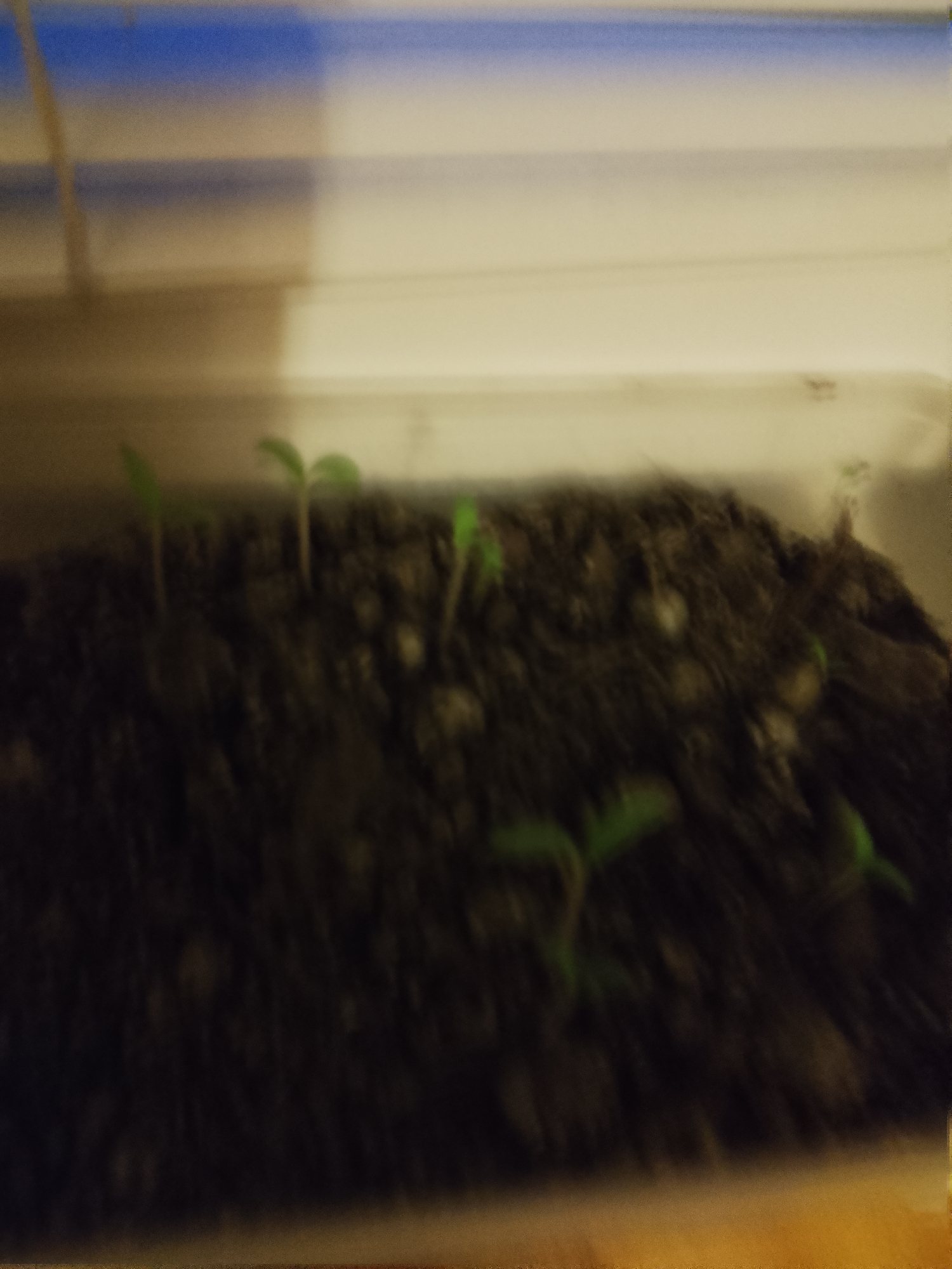 The image displays an indoor scene, specified as being in Levice, Slovakia, featuring multiple small plant seedlings. Approximately five to six green sprouts, each characterized by a developing stem and cotyledon leaves, are observed emerging from dark, clumpy soil. The soil occupies the lower half of the frame and is contained within what appears to be a translucent or light-colored rectangular planter, the upper edge of which is visible above the soil line. The background is out of focus, presenting a distinct horizontal blue band at the top, positioned above a wider, light-beige horizontal surface. A slender, light-colored vertical element is faintly discernible on the left side of the background. No individuals are present. The scene is illuminated by subdued ambient light originating from the brighter background, creating a contrast with the darker foreground.